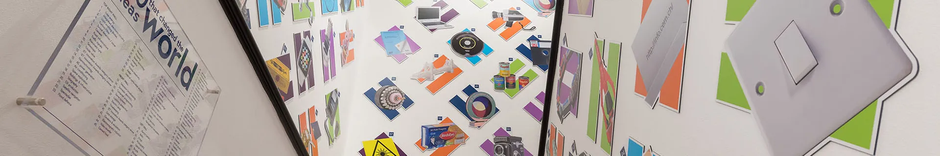 The main stairwell at Austin Court, linking the ground and first-floor event spaces, showcases 100 ideas that changed the world, as chosen by IET members.