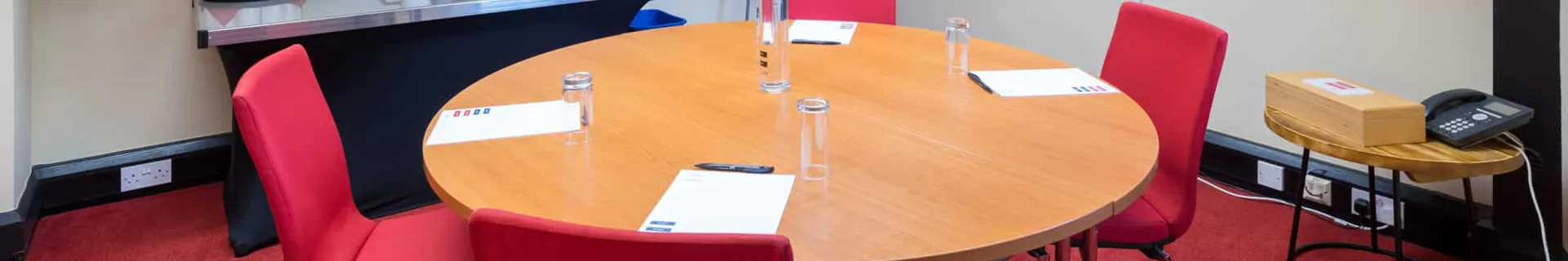- Boardroom layout includes pads and pens in room