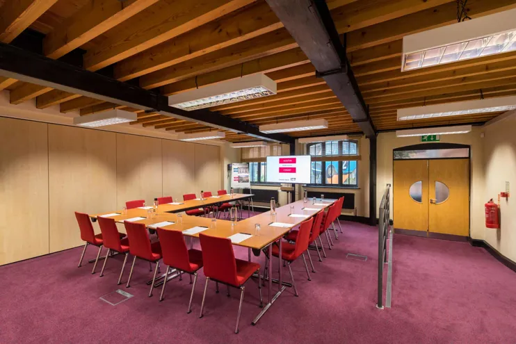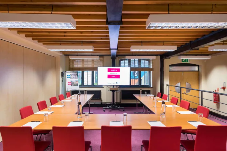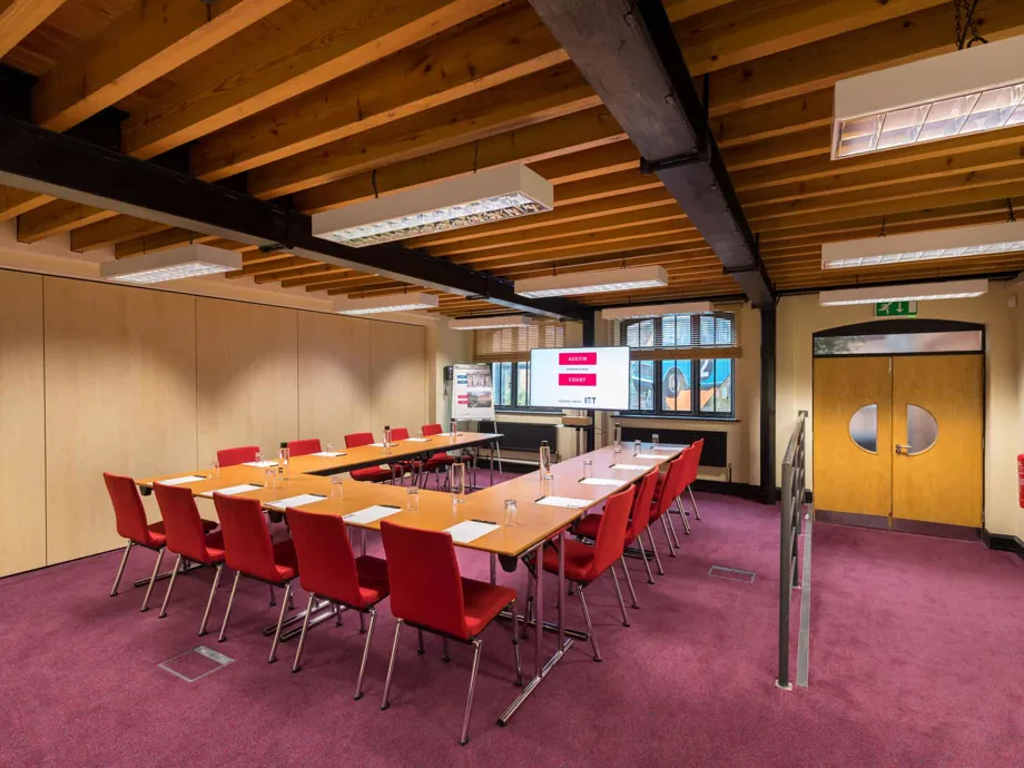 Whether U-shaped, boardroom, classroom, or theatre style, the room’s eye-catching wooden beams and large windows, typical of the Austin Court aesthetic, provide a sense of purpose and occasion for every event.